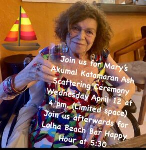 Please contact Mónica Estrada at 984 116 3386. Spaces are limited and you must reserve your place on the Catamaran. Hope to see you at Lol Ha, for a cash bar, to lift a glass, to our friend Mary.