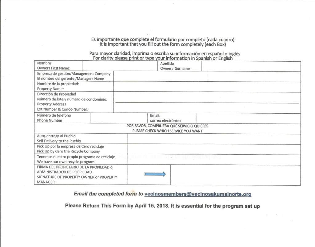 To participate is a very simple process. First fill out the attached form and email it back to Vecinos. If you already recycle, mark the form to signify this. The collected information is vital to setting up the best operating system possible. If you own a condo, please ask your building manager or HOA manager how your building could set up for the entire complex to participate.
