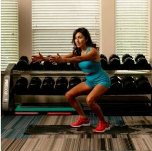 Body-weight Squats. Stand with feet hip distance apart, toes forward. Bend your knees and lower yourself until your thighs are parallel to the floor, keeping your weight in your heels. Extend your arms in front of you if you need help with balance, or squat lower if it’s too easy. Repeat 10 times. Hold a dumbbell to add to the difficulty.