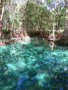 Literally translated as Eye of Water, the Ojo de Agua is a natural rockpool fed by a freshwater spring bubbling up from under the ground. Set amidst mangroves not far from the flamingo feeding ground the spring was the last stop on our tour.  The water is such a lovely aqua blue and so crystal clear it is well worth a quick look. You can take a dip while you are there.  Even the mangroves were fun. Gliding through as silently as we could we spied a couple of small crocodiles lurking in the shadows waiting for unsuspecting prey.