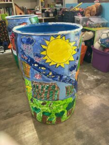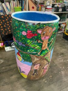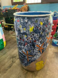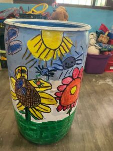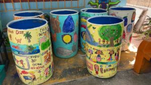Coming soon! The Hekab Be Library children were asked to paint trash bins for North Akumal. Prior to his death, Neal Breton of  Akumal Norte purchased the bins and paint. Under the supervision of artist Rory Eade a dozen of these brightly colored artworks were created. Keep your eyes out!
