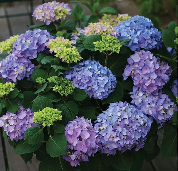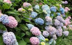 Hydrangeas are the beautiful, large bushes covered with large blooms of blue, white, or pink flowers.   The color of the bloom changes to blue in acidic soil and to pink in soil with more lime.  It is even possible to have different color blooms on the same plant. They are easy to grow and resistant to most pests and diseases.