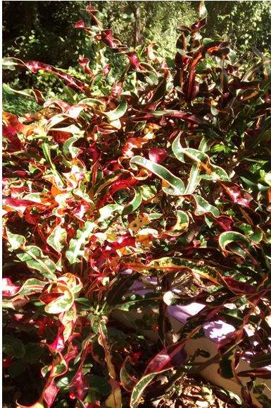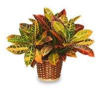 Grown for their brightly colored and marked leaves crotons (Codiaeum variegatum) come in a wide variety of leaf shapes and colors – reds, oranges, yellows, pinks, purple, greens, and white. They are native to India and Malaysia and are usually quite full with the leaves forming clusters to create color patterns. Some varieties grow up to 10′ tall, but there are smaller varieties; crotons can be pruned to shape. Many crotons grow best in full sun, but others prefer partial shade.