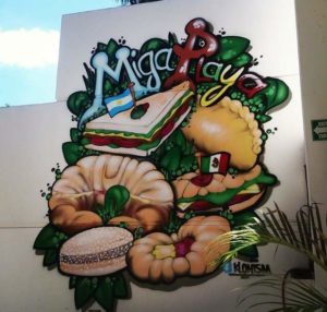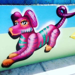 Since he’s been in the Riviera Maya area, Jake has worked on projects in Tulum at Cuba Ko Blanco and in Playa del Carmen. Probably the largest is a 30 meter long mural at Playa Animal Rescue, a work still in progress. Also, on 25th Ave. a few blocks north of Constituyentes you can see a 10 meter tall Klonism shouting out the bakery name — Miga Playa Bakery!