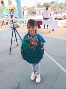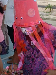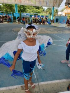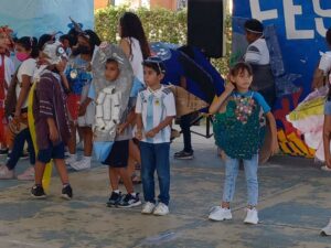 Children from the pueblo were in costumes showcasing the various sea life that is part of the Mesoamerican Reef System. Once the children were gathered together, they paraded through the Pueblo, then were judged for the great work they did in creating their costumes. Amy was one of the judges, while I took care of our table with avid painters.