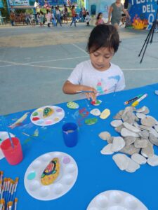 On Saturday, March 12, 2022, I had the good fortune to help my friend Amy. She set up a table under the “dome” in the Akumal pueblo to let children paint rocks as part of the activities associated with the festival. Amy supplied the materials for the children to paint their chosen rocks and encouraged them to leave the rocks around the pueblo.