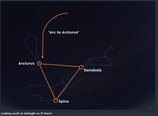 You could also use the some of the stars in The Plough to ‘arc towards Arcturus’ as shown in the diagram above – tracing the curve of the handle of The Plough and extending the line across the sky should bring you to Arcturus, a distinctive red giant star and the fourth brightest star in the sky. From Arcturus, Denebola will be to the right and Spica below, closer towards the horizon.
