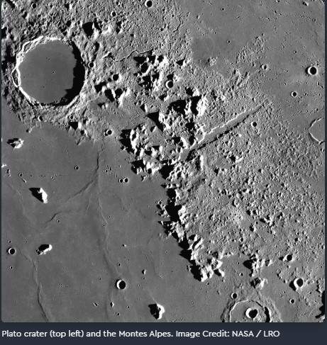 To the right of the Plato Crater you’ll be able to pick out the arc of Montes Alpes, a mountain range with peaks ranging from 1,800 – 2,400 metres above the lunar equivalent of sea level. When these mountains are illuminated from a low angle you’ll see their shadows cast onto the basin of Mare Imbrium.
