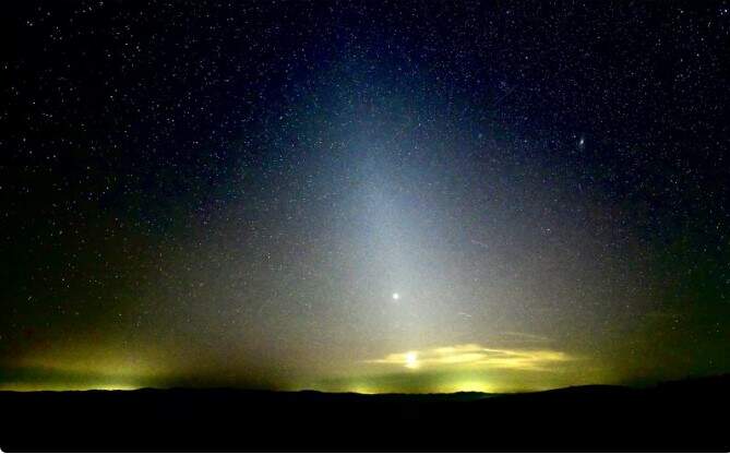 View at EarthSky Community Photos. | Michael Flynn captured this image on February 19, 2023, near Pine Mountain Club, California. He wrote: “The zodiacal light over the Pacific … at the top of the image is the Pleiades star cluster. At the bottom of the image are the planets Jupiter and Venus setting into the light pollution and marine layer.”