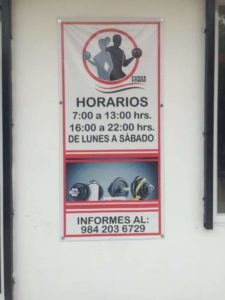 There’s a Gym in the pueblo! Turn left off main street one block past Dr. Nestor’s and go to end of the road. The Gym is on your right. The equipment is spiffy and there’s plenty of it. Harold Beltrán is the young man in charge – he’s bilingual and always on deck. The individual monthly rate is $400 mx; a day pass is $200 mx. There are also special deals for 6-mo. and 12-mo. memberships. Check the sign below for hours.