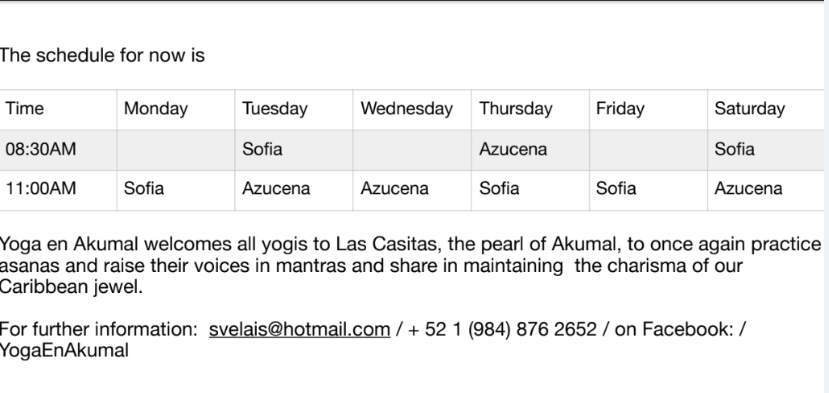 Yoga returns to Akumal! Venue is Las Casita #19. Turn into Las Casitas to the north of CEA and follow the path that runs along the left side of the first casita building. Go all the way around to the back and you’ll see #19. The studio is upstairs, but sessions may take place on the lawn. Parking is not available at the studio, so use the lots.
